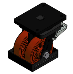 Wir entwickelten eine spezielle Montage aus 2 Harzreifen um den Anforderungen der hohen Tragfähigkeit und hohen Temperaturaussetzung gerecht zu werden. Das Bestandteil besteht aus eine Gabel für schwere Lasten, doppelter Bremse und Fussschutz, gemäss den Anforderungen des Projektes.