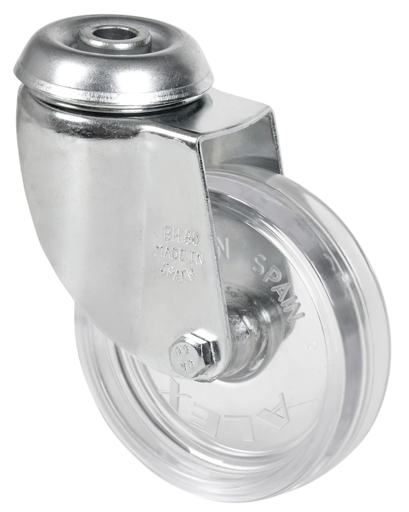 Hergestellt aus tiefgezogenem Stahlblech gepresst bis 2 mm. Ausführung: verzinkt. Befestigungsarten: Anschraubplatte und Rückenloch. Radkörper aus Holz und Laufbelag aus Gummi, Polycarbonat.Radfarbe. Farben: Buche, Kirsche, ähnlich Kristall. Verfügbar mit Feststeller.