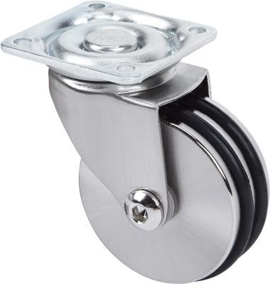 Material: Stahlblech.Ausführung: vernickelt. Befestigungsarten: Schwenk-Platte.Vernickeltes Aluminium (Edelstahl-Effekt) mit doppeltem Laufbelag aus Polyurethan.Verfügbar mit Feststeller.