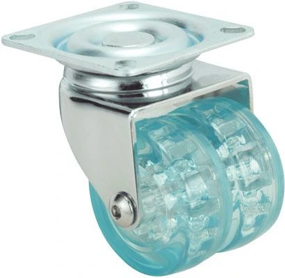 Material: Stahlblech.Ausführung: Verchromt poliertBefestigungsarten: PlatteRadkern aus Polycarbonat und Doppelrad mit Laufbelag aus Polyurethan Transparentfarben: blau oder grün Verfügbar mit Feststeller