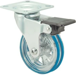 Material: Stahlblech.Ausführung: Verchromt Poliert.Befestigungsarten: Schwenk-Platte.Radkörper aus lichtdurchlässigem Acryl und Laufbelag aus farbigem Polyurethan.Farben: Orange, Grün, Blau, Schwarz, Rot, Gelb.Verfügbar mit Feststeller.