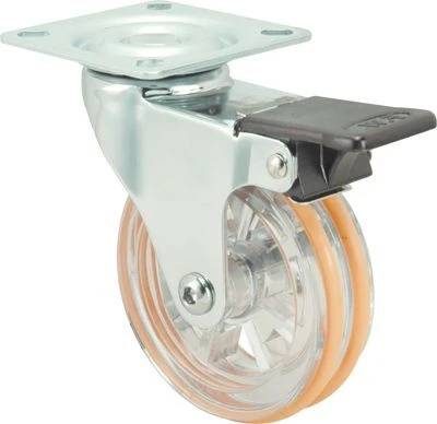 Material: Stahlblech.Ausführung: Verchromt Poliert.Befestigungsarten: Schwenk-Platte.Radkörper aus lichtdurchlässigem Acryl und Laufbelag aus farbigem Polyurethan.Farben: Orange, Grün, Blau, Schwarz, Rot, Gelb.Verfügbar mit Feststeller.