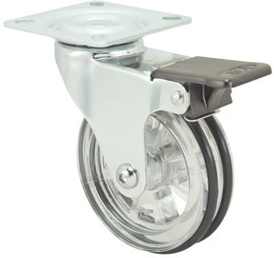 Material: Stahlblech.Ausführung: Verchromt Poliert.Befestigungsarten: Schwenk-Platte.Radkörper aus lichtdurchlässigem Acryl und Laufbelag aus farbigem Polyurethan.Farben: Orange, Grün, Blau, Schwarz, Rot, Gelb.Verfügbar mit Feststeller.
