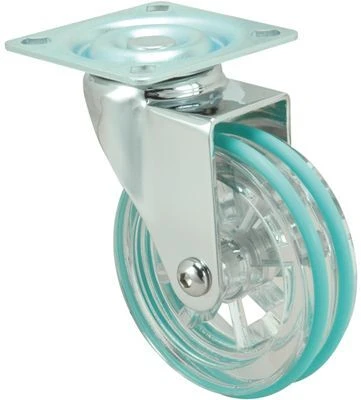Material: Stahlblech.Ausführung: Verchromt Poliert.Befestigungsarten: Schwenk-Platte.Radkörper aus lichtdurchlässigem Acryl und Laufbelag aus farbigem Polyurethan.Farben: Orange, Grün, Blau, Schwarz, Rot, Gelb.Verfügbar mit Feststeller.