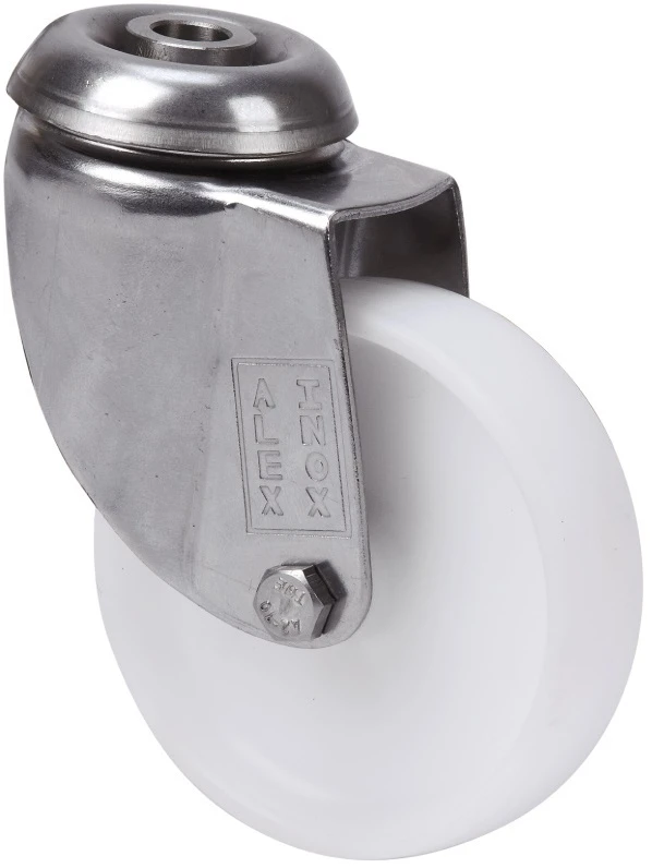 Räder aus weissem Polypropylen, alle Komponenten sind aus nicht rostendem Stahl (AISI 304). Geeignet für Ladungen bis zu 80 kg.