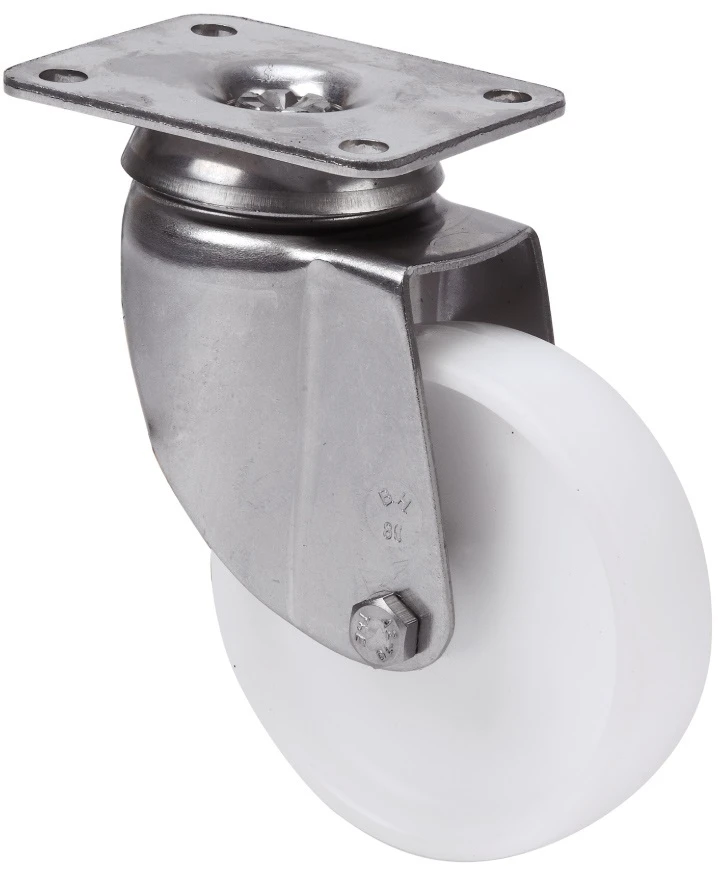 Räder aus weissem Polypropylen, alle Komponenten sind aus nicht rostendem Stahl (AISI 304). Geeignet für Ladungen bis zu 80 kg.