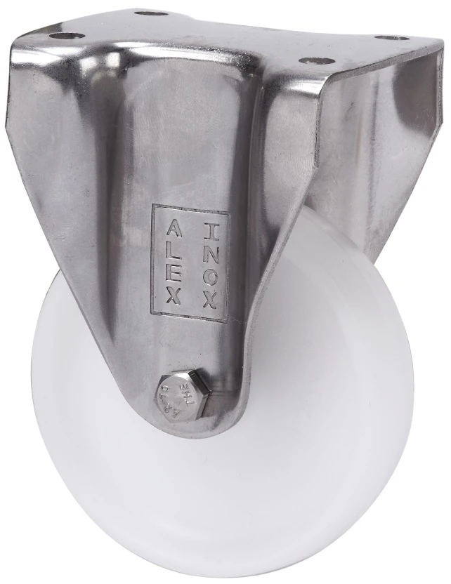 Räder aus weissem Polypropylen, alle Komponenten sind aus nicht rostendem Stahl (AISI 304). Geeignet für Ladungen bis zu 80 kg.