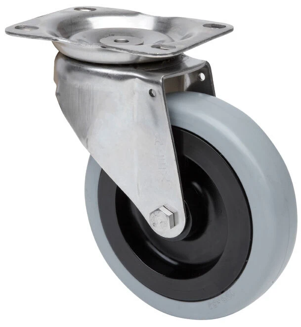 Räder aus natürlichem schwarzem Gummi, alle Bestandteile sind aus nicht rostendem Stahl (AISI 304). Geeignet für Ladungen bis zu 135 kg.