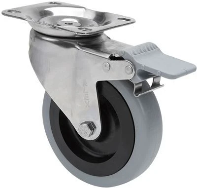 Räder aus natürlichem schwarzem Gummi, alle Bestandteile sind aus nicht rostendem Stahl (AISI 304). Geeignet für Ladungen bis zu 135 kg.