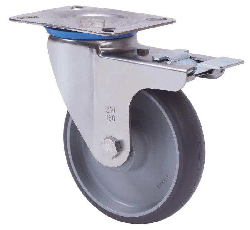 Räder aus gespritztem grauem Gummi, alle Bestandteile sind aus rostfreiem Stahl (AISI 304). Geeignet für Ladungen bis zu 180 kg.