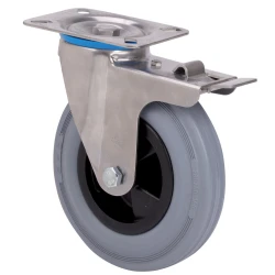Räder aus natürlichem schwarzem Gummi, alle Bestandteile sind aus rostfreiem Stahl (AISI 304). Geeignet für Ladungen bis zu 215 kg.