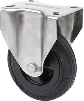 Räder aus natürlichem grauem Gummi, alle Bestandteile sind aus rostfreiem Stahl (AISI 304). Geeignet für Ladungen bis zu 215 kg.