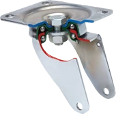 Hergestellt aus tiefgezogenem Stahlblech gepresst bis 2,5 mm.Verchromte Ausführung.Lenkrollen-Gehäuse mit zweifacher Kugellagerung im Drehkranz, verstärkt durch den Einbau von gehärteten Lagerschalen.Hergestellt gemäß Europanorm EN 12530.