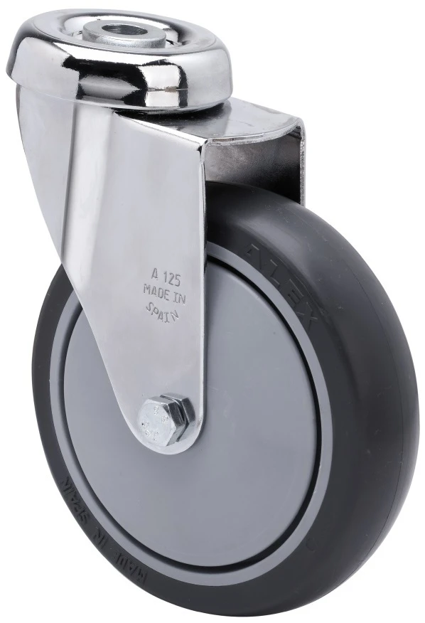 Räder mit Polyamidkern und Reifen aus thermoplastischem grauem Gummi. Geeignet für Ladungen bis zu 100 kg.
