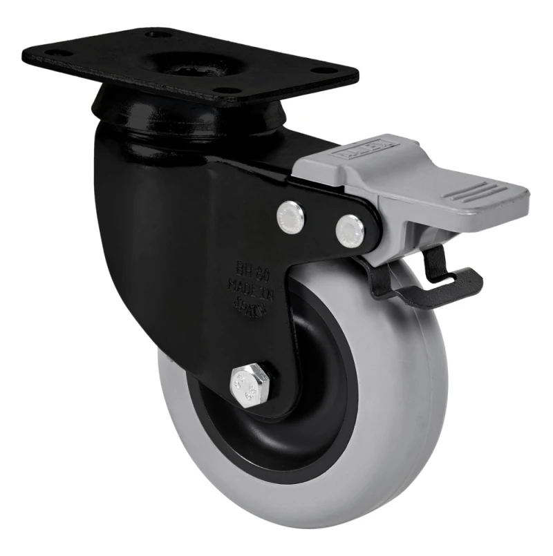 Räder aus grauem gespritztem Gummi. Geeignet für Ladungen bis zu 60 kg.