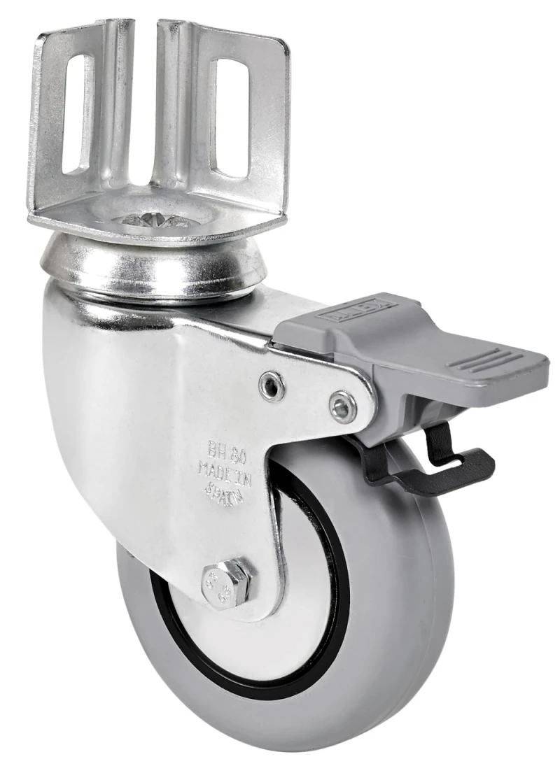 Räder aus grauem gespritztem Gummi. Geeignet für Ladungen bis zu 70 kg.