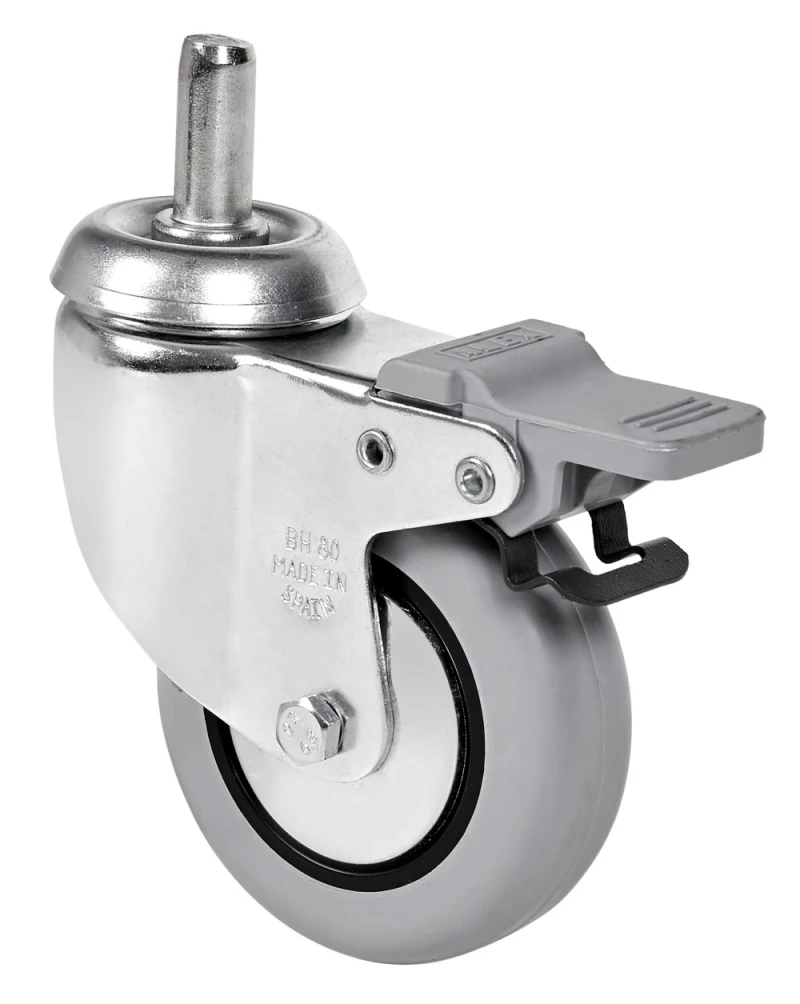 Räder aus grauem gespritztem Gummi. Geeignet für Ladungen bis zu 70 kg.