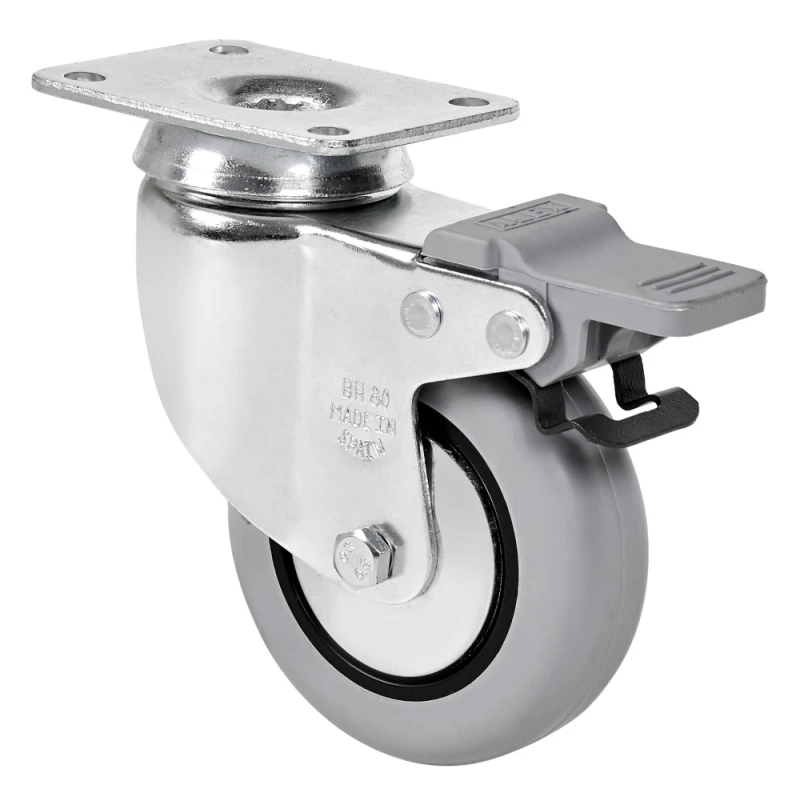 Räder aus grauem gespritztem Gummi. Geeignet für Ladungen bis zu 70 kg.