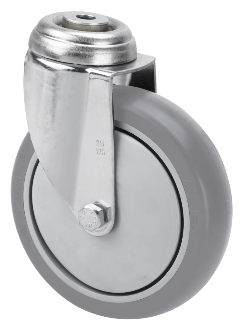 Räder aus grauem gespritztem Gummi. Geeignet für Ladungen bis zu 90 kg.