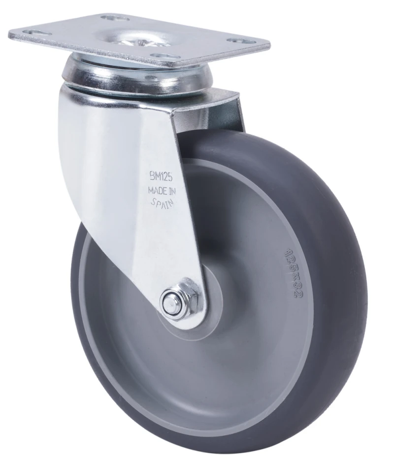 Räder aus gespritztem grauem Gummi. Geeignet für Ladungen bis zu 90 kg.