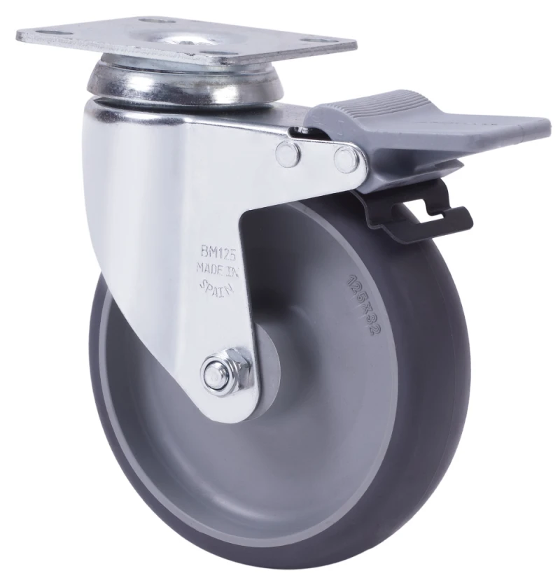 Räder aus gespritztem grauem Gummi. Geeignet für Ladungen bis zu 90 kg.