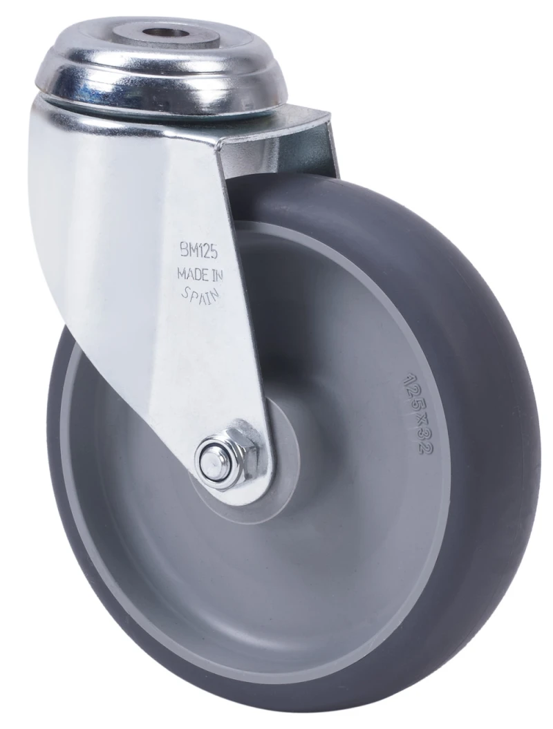 Räder aus gespritztem grauem Gummi. Geeignet für Ladungen bis zu 90 kg.