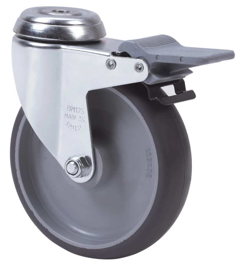 Räder aus gespritztem grauem Gummi. Geeignet für Ladungen bis zu 90 kg.
