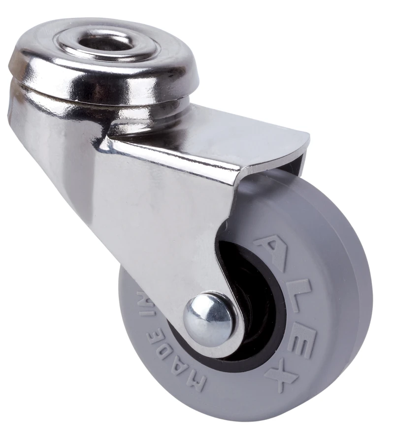 Hergestellt aus tiefgezogenem Stahlblech gepresst bis 2 mm. Stahl vernickelt. Lenkrollen-Gehäuse mit zweifacher Kugellagerung im Drehkranz. Gummi-Räder Ø 50, Ø 60 mm mit Fadenschütze ausgestattet. Hergestellt gemäß Europanorm EN 12528.