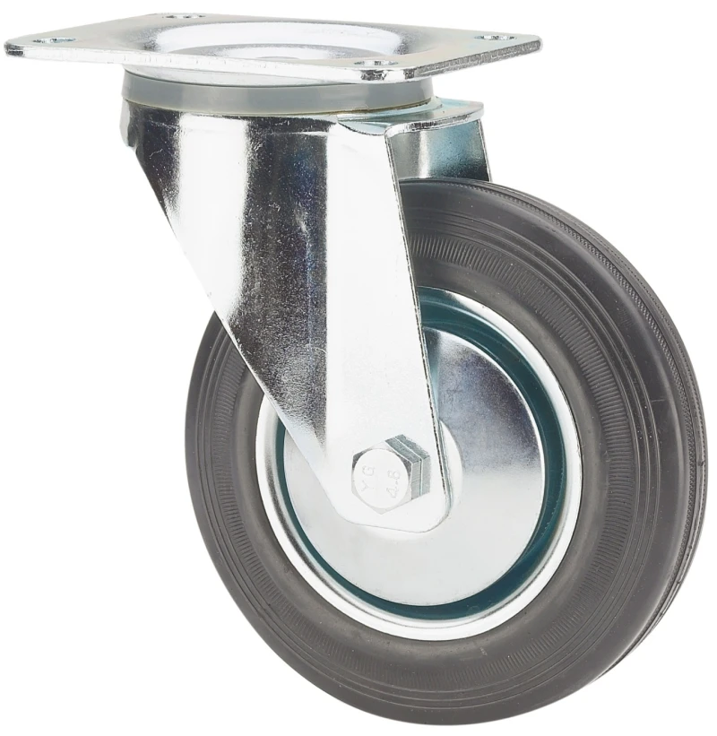 Räder mit Metallkern und Reifen aus schwarzem Gummi, geeignet für Ladungen bis zu 250 kg.