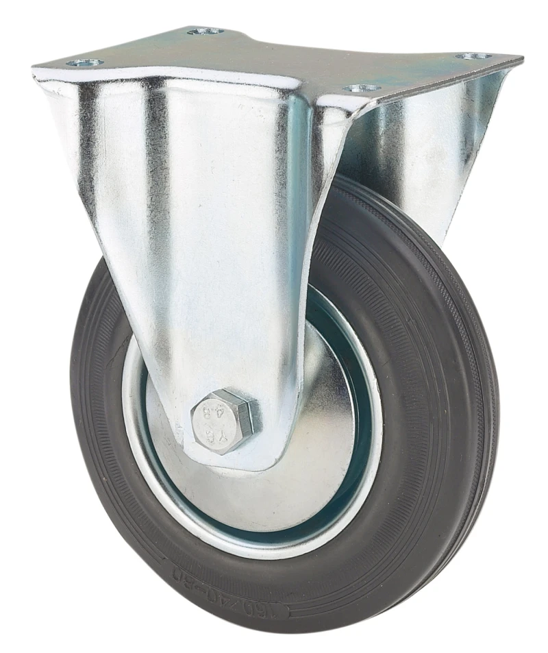 Räder mit Metallkern und Reifen aus schwarzem Gummi, geeignet für Ladungen bis zu 250 kg.