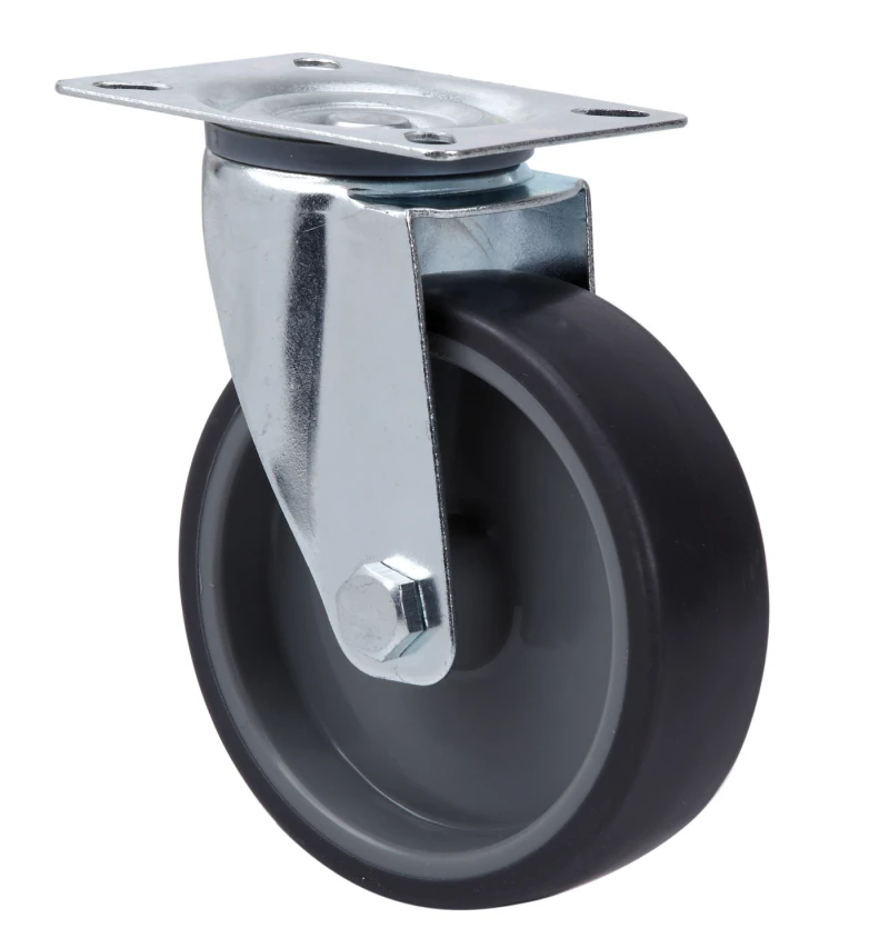 Räder aus grauem gespritztem Gummi und Reifen aus Polypropylen, geeignet für Ladungen bis zu 110 kg.