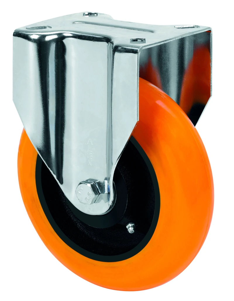Räder mit Stahlkörper und Laufbelag aus geschmolzenem Polyurethan mit einer Härte von 95º shore A. Mit ovalförmigem Reifenprofil, besonders geeignet für schwere Lasten bis zu 700 kg.