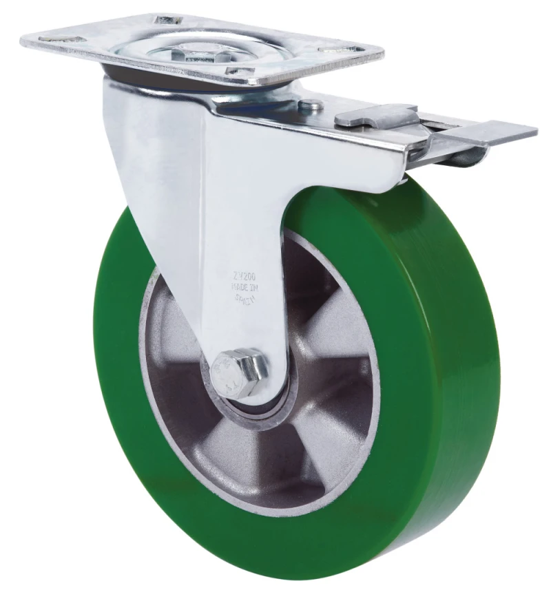 Räder mit Aluminiumkörper und Laufbelag aus grünem Polyurethan mit einer Härte von 80º shore A. Besonders empfohlen für Lasten bis zu 700 kg.