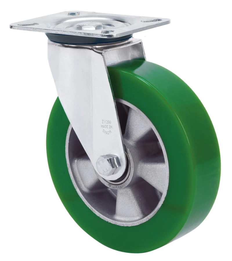 Räder mit Aluminiumkörper und Laufbelag aus grünem Polyurethan mit einer Härte von 80º shore A. Besonders empfohlen für Lasten bis zu 700 kg.