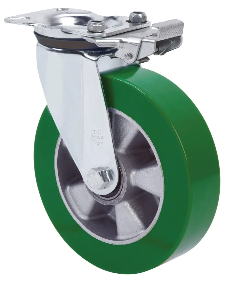 Räder mit Aluminiumkörper und Laufbelag aus grünem Polyurethan mit einer Härte von 80º shore A. Besonders empfohlen für Lasten bis zu 700 kg.
