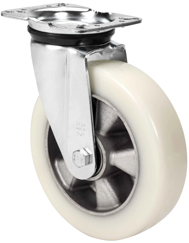 Rollen aus Aluminiumkern und Reifen aus geschmolzenem weissen Polyurethan mit einer Härte von 88º shore A, besonders geeignet für schwere Lasten bis zu 650 kg.