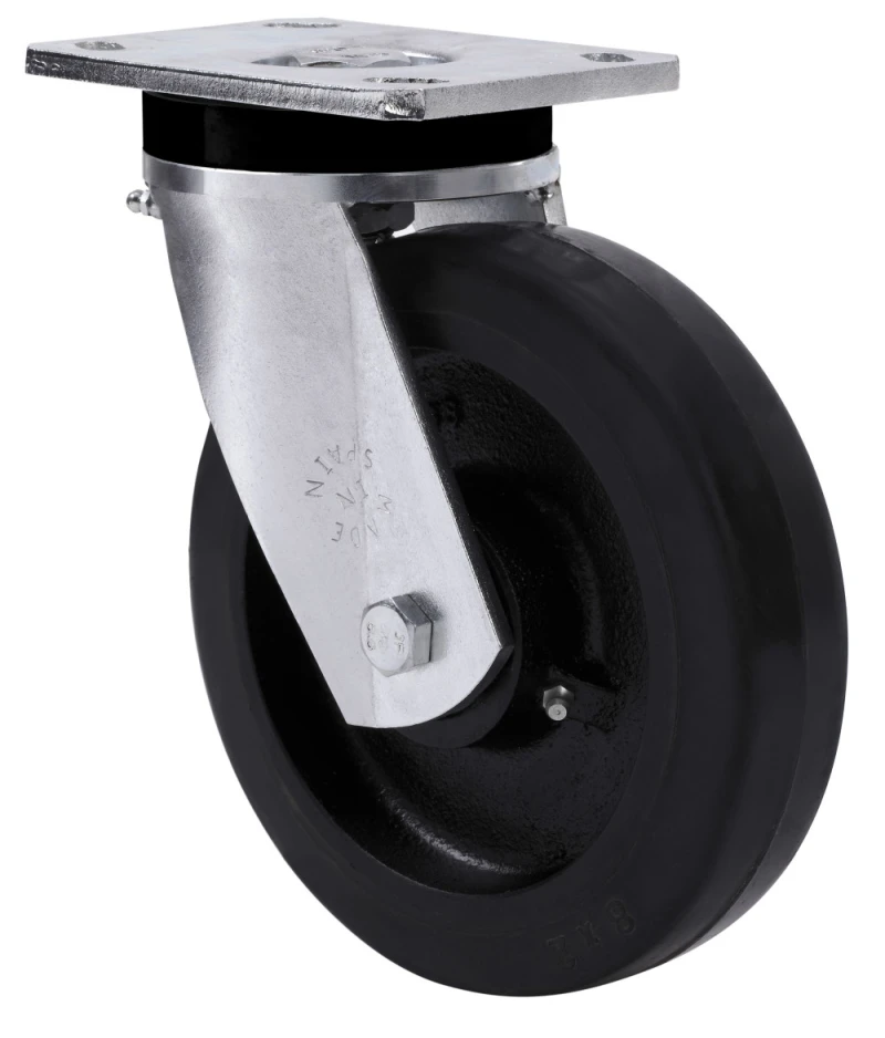 Räder mit Stahlkern und Reifen aus schwarzem natürlichem Gummi, geeignet für Ladungen bis zu 600 kg.