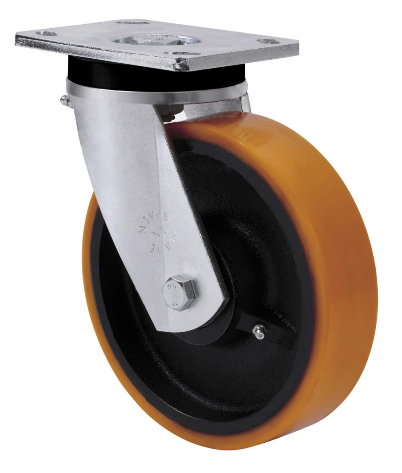 Räder mit Stahlkern und Reifen aus geschmolzenem Polyurethan mit einer Härte von 95º shore A. Geeignet für Ladungen bis zu 1000 kg.
