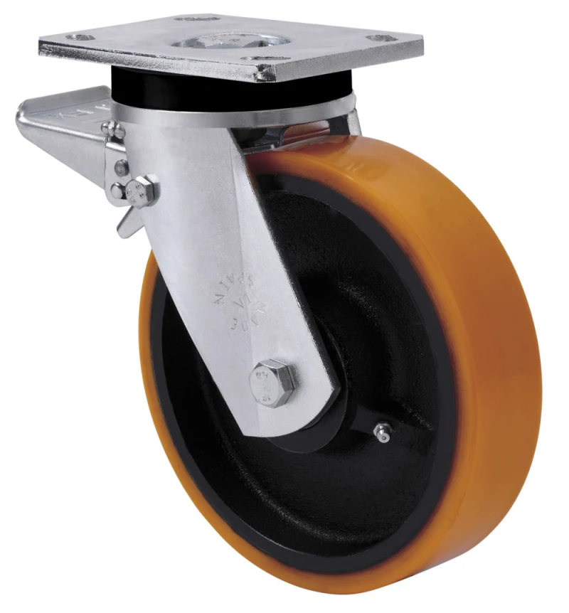 Räder mit Stahlkern und Reifen aus geschmolzenem Polyurethan mit einer Härte von 95º shore A. Geeignet für Ladungen bis zu 1000 kg.