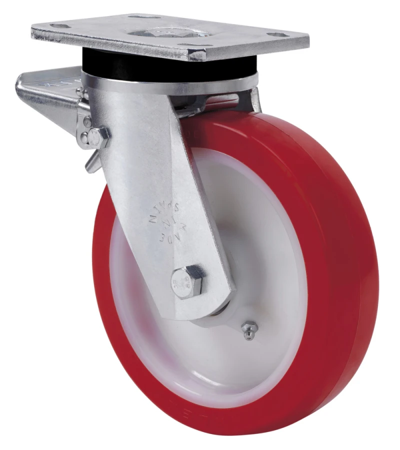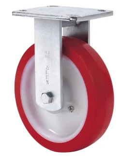 Räder aus weissem Nylonkern und Reifen aus rotem Polyurethan mit einer Härte von 90-95º shore A. Geeignet für Ladungen bis zu 600 kg.