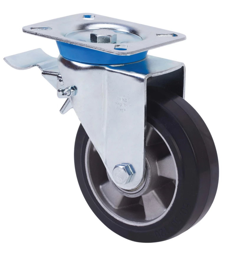 Räder mit Stahlkern und Reifen aus elastischem schwarzem Gummi mit einer Härte von 70º shore A. Geeignet für Ladungen bis zu 450 kg.
