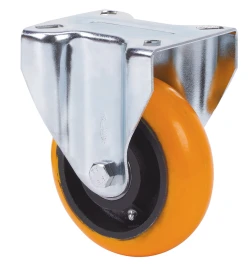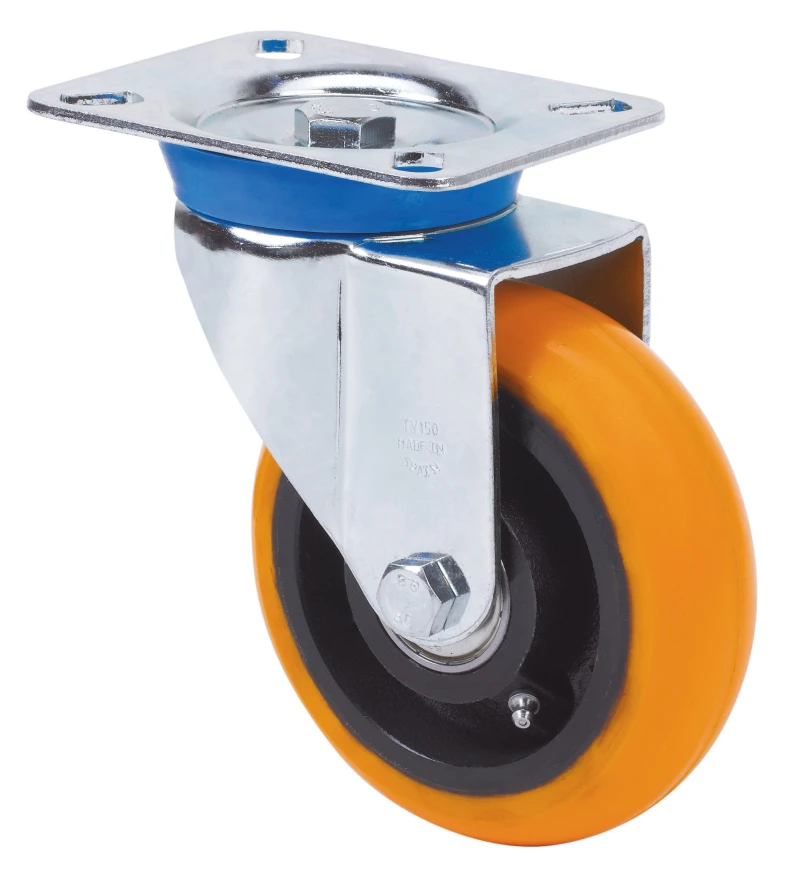 Räder mit Stahlkern und Reifen aus geschmolzenem Polyurethan mit einer Härte von 95º shore A und kugelförmigen Reifenprofil. Geeignet für Ladungen bis zu 800 kg.