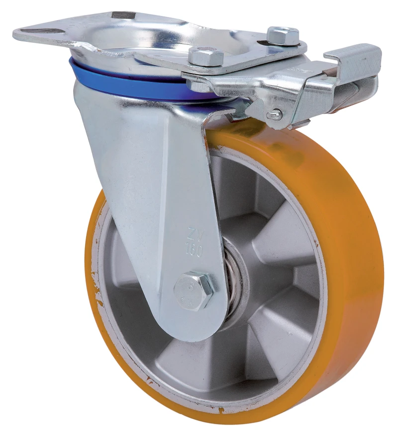 Räder mit Aluminiumkern und Reifen aus geschmolzenem Polyurethan mit einer Härte von 95º shore A, geeignet für Ladungen bis zu 400 kg.