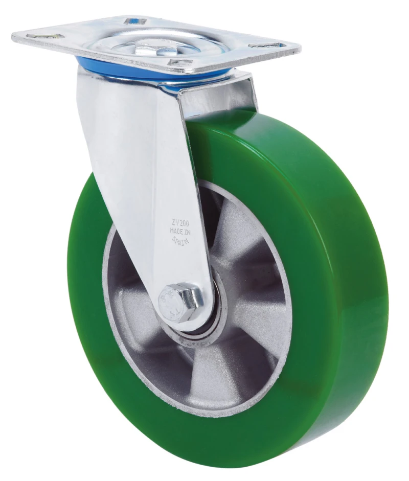 Räder mit Aluminiumkern und Reifen aus grünem Polyurethan mit einer Härte von 80º shore A. Geeignet für Ladungen bis zu 400 kg.