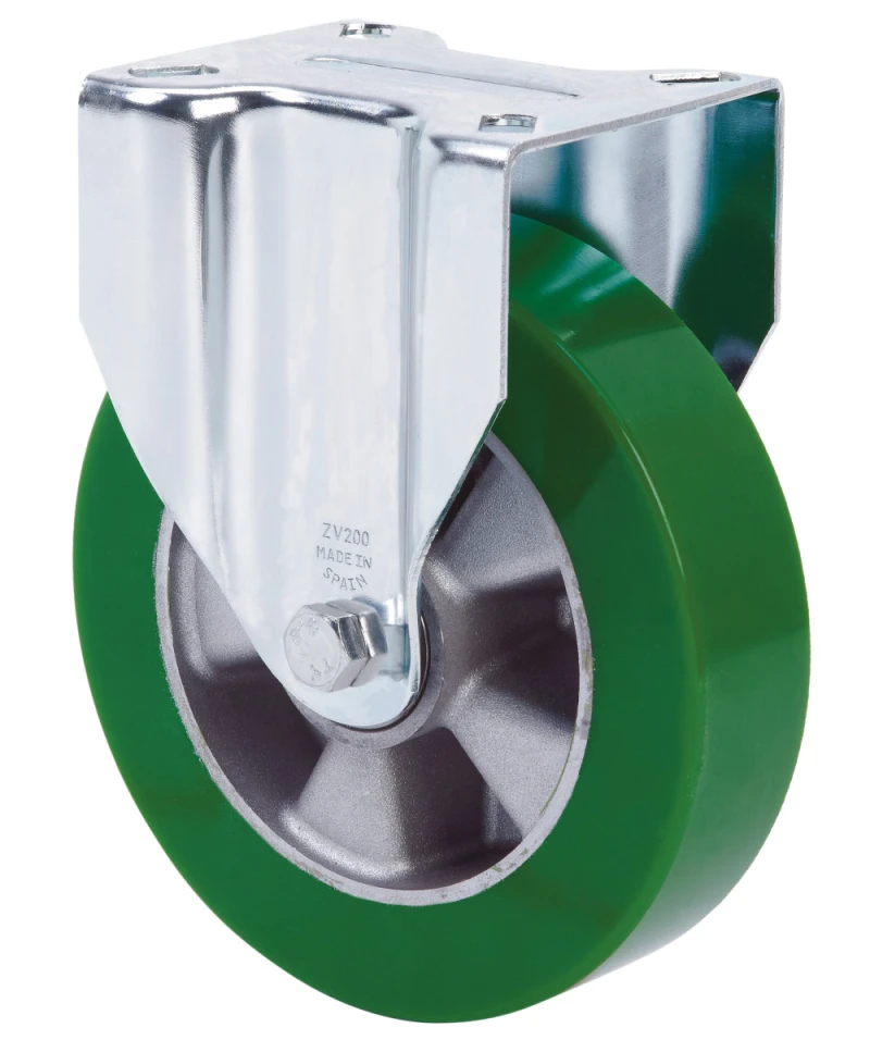 Räder mit Aluminiumkern und Reifen aus grünem Polyurethan mit einer Härte von 80º shore A. Geeignet für Ladungen bis zu 400 kg.