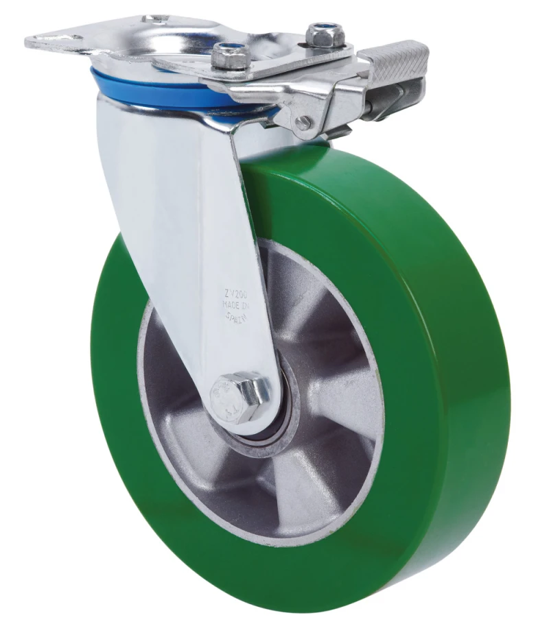 Räder mit Aluminiumkern und Reifen aus grünem Polyurethan mit einer Härte von 80º shore A. Geeignet für Ladungen bis zu 400 kg.