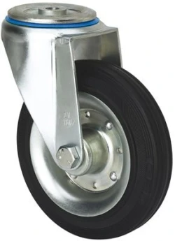 Räder mit Metallkern und Reifen aus schwarzem Gummi, geeignet für Ladungen bis zu 250 kg.