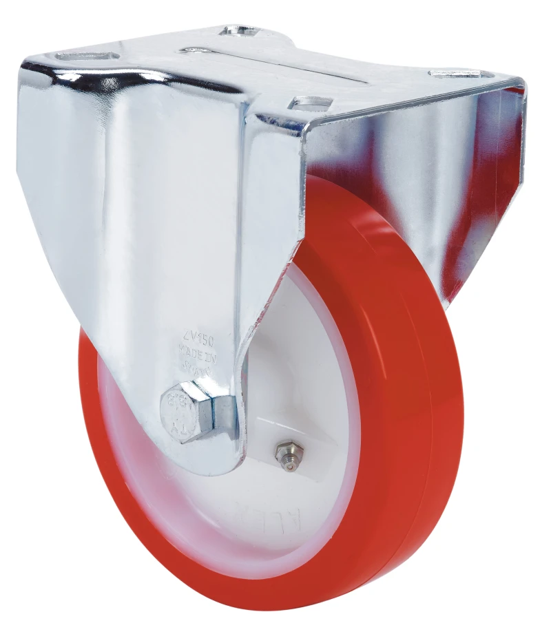 Räder aus weissem Nylonkern und Reifen aus rotem gespritztem Polyurethan mit einer Härte von 90-95º shore A. Geeignet für Ladungen bis zu 400 kg.