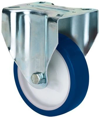 Räder mit weissem Polypropylenkern und Reifen aus gespritztem blauem Polyurethan mit einer Härte von 80º shore A. Geeignet für Ladungen bis zu 250 kg.