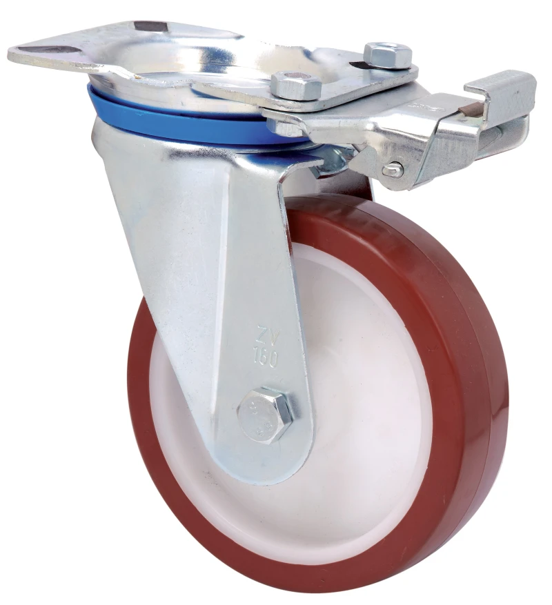 Räder mit Kern aus weissem Polypropylen und Reifen aus gespritztem braunem Polyurethan mit einer Härte von 95 shore A, geeignet für Ladungen bis zu 300 kg.